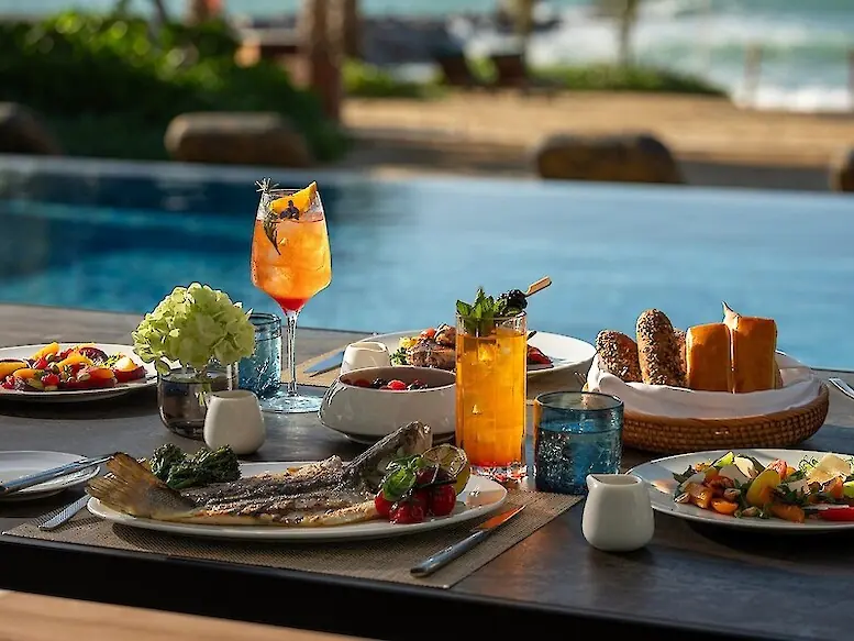 Forget the flashy gold and marble that Dubai is famous for. Alizée's philosophy lies in understated harmony, where nature, light, and the sea become the main elements of luxury. It’s that relaxed elegance for which people travel to Saint-Tropez or Nice, recreated right on the shores of the Persian Gulf. During the day, it’s a bright, sun-drenched space by the pool, perfect for a leisurely lunch or a peaceful family outing. In the evening, the restaurant undergoes a complete transformation: the lighting becomes soft and subdued, candles appear on the tables, and gentle lounge music plays in the background, creating an elegant and romantic atmosphere. The interior can be described as tactile, coastal minimalism. Everything here invites you to touch—warm, light wood, the cool roughness of terrazzo-style tiles. A pastel palette, ranging from sandy to creamy beige, seems filled with air and light, while live olive trees planted in ceramic pots seamlessly blur the boundary between the terrace and the dining room. The space is thoughtfully divided into zones: there’s a cozy main hall with panoramic windows, secluded private booths by the pool, and, of course, a spacious open terrace that serves as the guests’ main attraction.