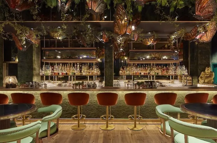 The stunning design is the work of the renowned Spanish studio Lázaro Rosa-Violán. The interior harmoniously blends natural materials—dark wood, marble, brass—with textiles in deep, rich shades of emerald, amber, and gold. Every detail contributes to creating an immersive experience: from hanging butterfly sculptures to art pieces styled after Amazonian fauna.