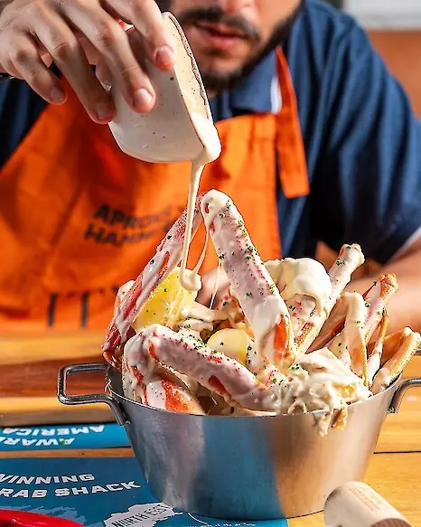 At the heart of Aprons & Hammers' concept lies the idea of "fun dining." The main interactive element that sets the tone for the entire evening is handing each guest a set of tools: a branded apron to keep them from getting messy, and a hammer for cracking crabs and lobsters. Dinner instantly turns into an engaging game and a shared adventure. The atmosphere here is fittingly lively, bustling, and extremely friendly. This is the perfect spot for large groups of friends and families with children, who enthusiastically join in the "food-hunting" process.