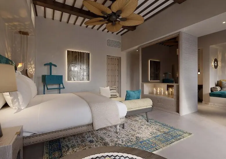 The rooms and suites at Bab Al Shams continue the overall concept, offering guests a secluded and comfortable retreat. The interiors are designed in a traditional Arabic style, yet with a modern take on luxury. Inside, you're greeted by the coolness of terracotta tiles beneath your feet, the solidity of furniture crafted from dark natural wood, and an explosion of intricate oriental patterns on blankets and pillows. Soft, warm light from wrought-iron fixtures completes the atmosphere of a secluded retreat. Room categories range from spacious Superior rooms to luxurious Deluxe suites. A key feature of nearly all rooms is the presence of a private balcony or terrace, offering mesmerizing views of endless dunes, courtyard pools, or the resort's lush gardens. This is your personal space for morning coffee accompanied by birdsong or evening stargazing.