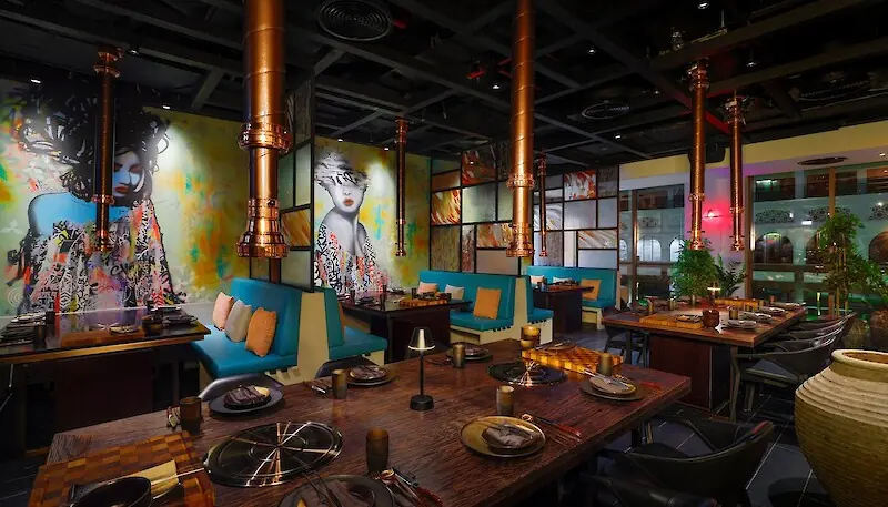 Smoki Moto isn't just dinner—it's a party where Korean barbecue takes center stage. Located at the Marriott Resort on Palm Jumeirah, this venue embraces the "vibe dining" concept: loud music, trendy crowds, and an atmosphere where socializing and fun are just as important as the food itself. It's Dubai's first restaurant with built-in open BBQ grills in every table, turning dinner into an interactive show. The dim lighting punctuated by neon flashes and lively DJ sets immediately set the right tone—this is a place you come to not just to eat, but to soak up the city's energy.