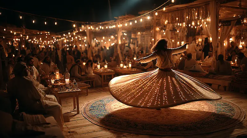 - Tanoura dance: A mesmerizing performance by a dancer in a vibrant, glowing costume, performing a mystical Sufi whirling dance.