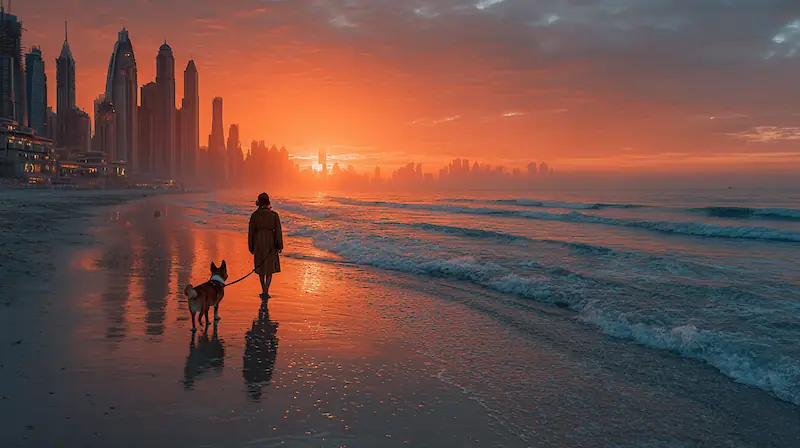 Location: Jumeirah Beach Residence (JBR) area. Atmosphere: Glamorous, urban, and extremely lively. Walking your dog along the famous JBR beach is a risky endeavor. The Dubai Marina area itself is known for its strict rules regarding animals, and security on The Walk promenade will almost certainly issue you a warning. Your only chance to slip in unnoticed is to come here at dawn, before 7 a.m., choose the most remote and deserted stretch of the beach, and hope for the best. This option is for the truly desperate.