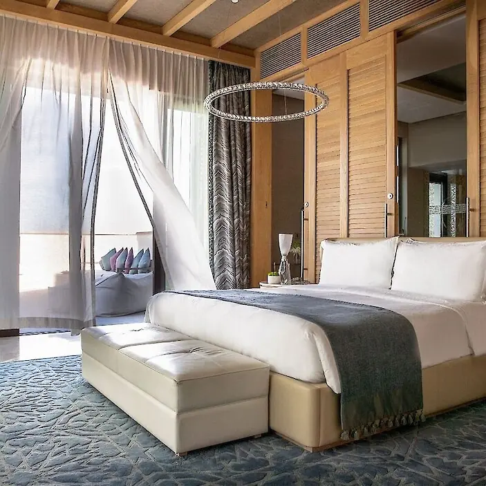 The room stock at Jumeirah Al Naseem includes 430 rooms and suites, all of which impress with their spaciousness and comfort. Even the basic Resort Deluxe rooms start at 51 square meters, significantly exceeding the standards of most city hotels. The key difference between categories lies in the view from the window, which is an integral part of the experience here. You can choose a room overlooking the lush resort gardens, the azure waters of the Persian Gulf, or one of Dubai's most iconic landmarks—the Burj Al Arab sail-shaped hotel.