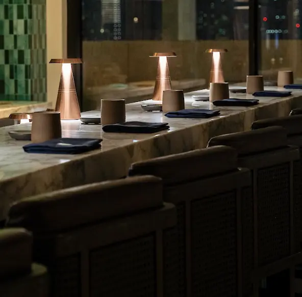 Moonrise deliberately steers clear of the ostentatious gold often found in many Dubai establishments. Its luxury lies not in glitter, but in sensations. The interior is designed as a cozy cocoon, where nothing distracts from the main focus—flavor. Imagine a combination of cool, coarse-textured marble, warm, velvety-to-the-touch walnut, and delicate, barely perceptible hints of brass. Subdued, multi-layered lighting plays across polished surfaces, creating an enveloping, almost intimate atmosphere. The focal point is a fiery-red bonsai enclosed in a glass cube—a vibrant accent against the dark color palette. Large panoramic windows blur the boundary between the dining area and the nocturnal city, turning the downtown lights into a living backdrop for your meal.