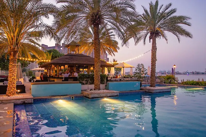 The club's centerpiece is a large, perfectly shaped swimming pool, surrounded by elegant palm trees and comfortable sun loungers. Its standout feature—particularly valuable in Dubai's climate—is the climate-control system, which makes swimming refreshingly cool in summer and delightfully pleasant in winter. A separate, secure children's area ensures peace of mind for our little guests. The atmosphere by the pool epitomizes pure relaxation. Forget DJ sets—here, the soundtrack is subtle lounge music, seamlessly blending with the gentle lapping of water and the rustling of palm fronds. This is a place where your only real struggle will be resisting the urge to drift off to sleep on a comfy lounger, occasionally interrupted only by ordering refreshing drinks delivered right to your spot.