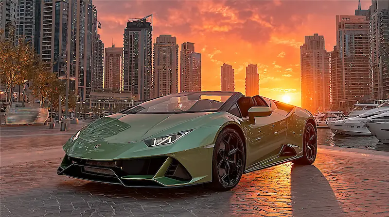 - Lamborghini Huracán EVO Spyder: Ультимативный открытый суперкар для максимального эффекта. Его пронзительный цвет, оглушительный рев атмосферного V10 и открытый верх не оставят равнодушным никого.
