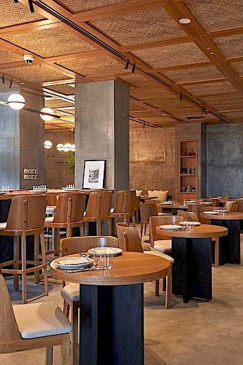 - Атмосфера и дизайн: Дизайн от T.ZED Architects – это современный минимализм с индустриальными нотками. Просторное помещение с высокими потолками, бетонные поверхности, натуральное дерево, открытая кухня, где можно наблюдать за работой поваров у огня. Атмосфера здесь живая, динамичная, но при этом достаточно расслабленная. Идеально для тех, кто ценит неформальный шик и кухню с характером.