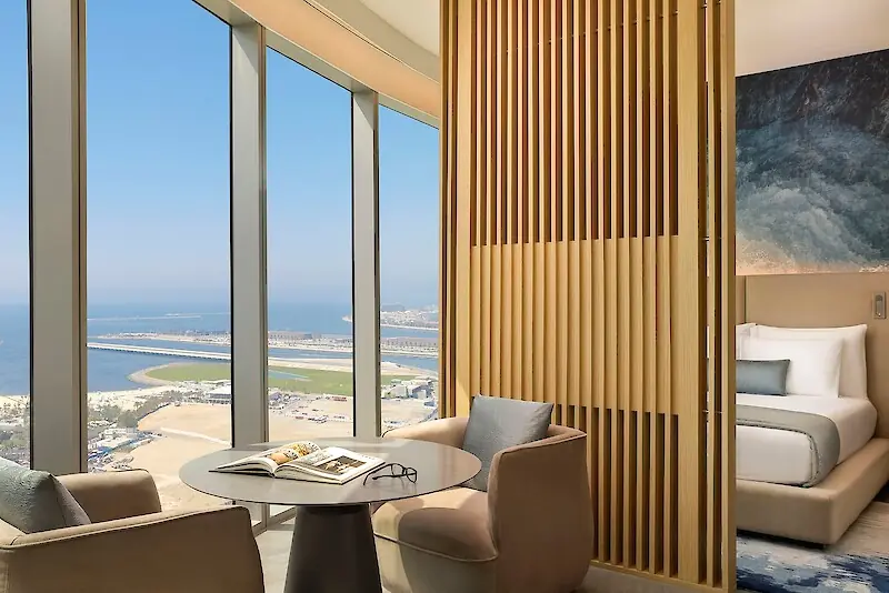 Отель готовится предложить гостям 1004 номера и люкса, и можно не сомневаться: главной «фишкой» каждого из них станут панорамные окна от пола до потолка. Концепция проста и гениальна: каждый номер — это ваша личная смотровая площадка с захватывающими видами на город, Марину или Персидский залив. Судя по рендерам, дизайн интерьеров будет под стать видам — элегантный и минималистичный, чтобы ничто не отвлекало от главного спектакля за окном.