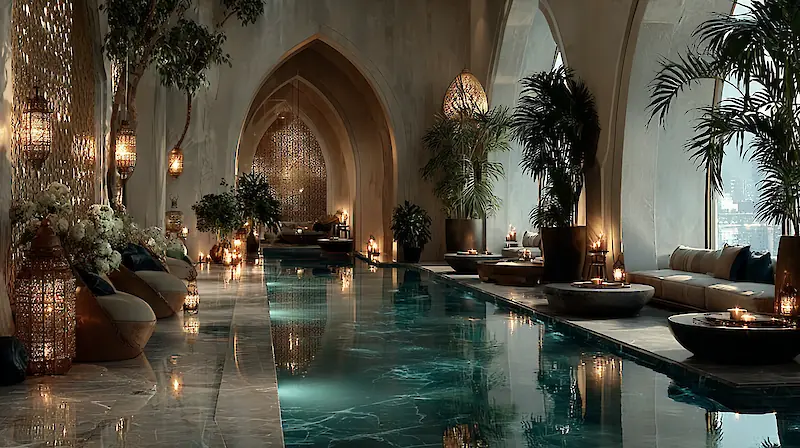 Ваше погружение начинается задолго до самой процедуры - с момента, как вы переступаете порог спа. Здесь атакуют все органы чувств, но делают это нежно. Свет приглушен, он играет на полированных поверхностях из натурального мрамора и оникса, заставляя мерцать свечи. Воздух густой и прохладный, пропитанный благородными ароматами уда, сандала и дамасской розы. Единственные звуки — это тихая, медитативная музыка и едва слышный плеск воды где-то в глубине. А когда вы, переодевшись в мягчайший халат, ступаете на теплый мраморный пол хаммама, вы понимаете: внешний мир со всей его суетой остался где-то очень далеко.