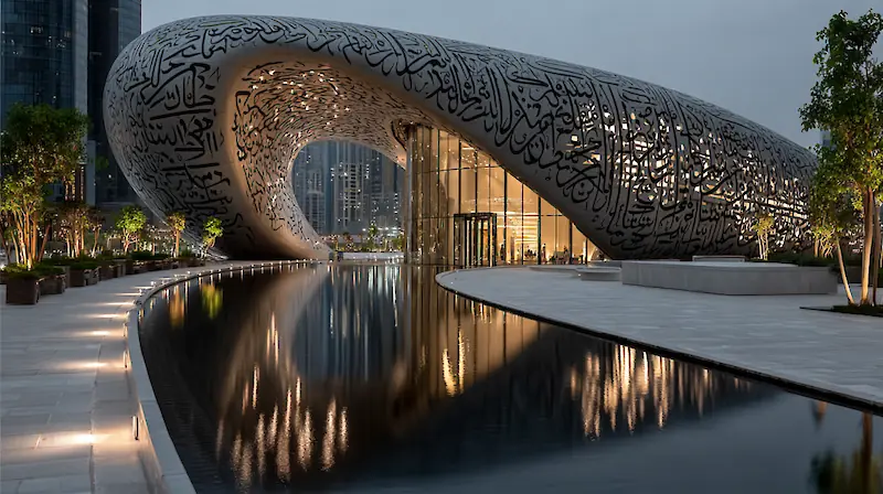 Здание музея не имеет ни одного угла и покрыто арабской каллиграфией – это цитаты правителя Дубая, посвященные будущему. Это не просто музей, а настоящее архитектурное послание человечеству.