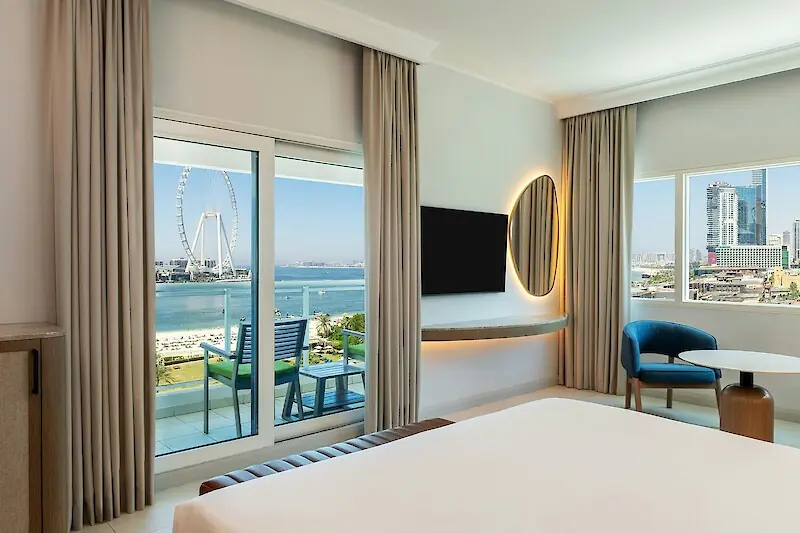 Essentially, your choice boils down to this: do you want to watch the vibrant life of the city or the serene sea horizon? Deluxe Walk View rooms overlook the bustling promenade The Walk, keeping you right in the heart of the action. Deluxe Sea View rooms offer panoramic views of the Persian Gulf, the beach, and the famous Bluewaters Island with the Ain Dubai Ferris wheel.