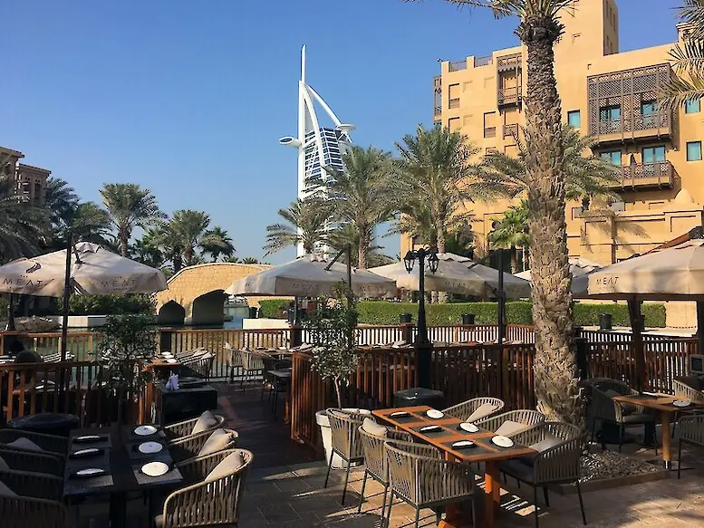 The restaurant in the Madinat Jumeirah complex offers a completely different vibe. Here, in the "Arab Venice," a calmer and more serene atmosphere prevails. From the terrace, you can enjoy a fairytale view of picturesque water channels, along which traditional abra boats glide leisurely, while on the horizon looms the legendary sail-shaped Burj Al Arab hotel. This place is perfect for a romantic dinner or a peaceful evening away from the hustle and bustle of the city. The ambiance here is resort-like, relaxed, and incredibly photogenic.
