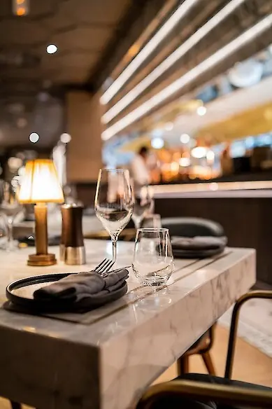 The atmosphere in the restaurant changes throughout the day. During the day, the atmosphere here is more relaxed and business-oriented, perfect for lunch. In the evening, especially on Thursdays and Fridays, the space comes alive with live music—saxophone or jazz vocals—transforming it into a vibrant and cosmopolitan spot.